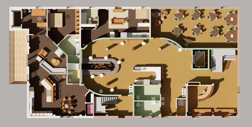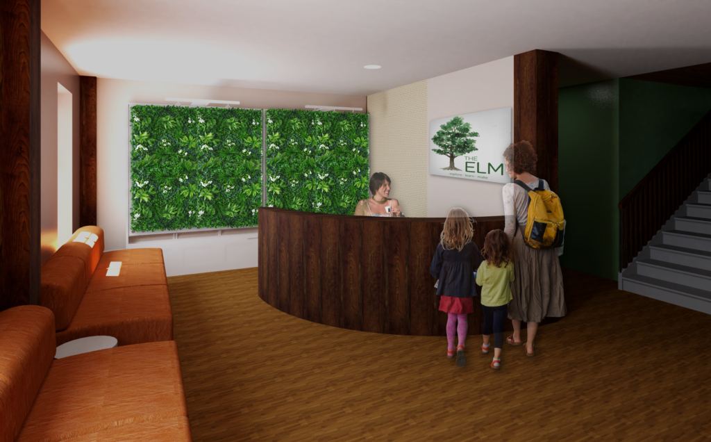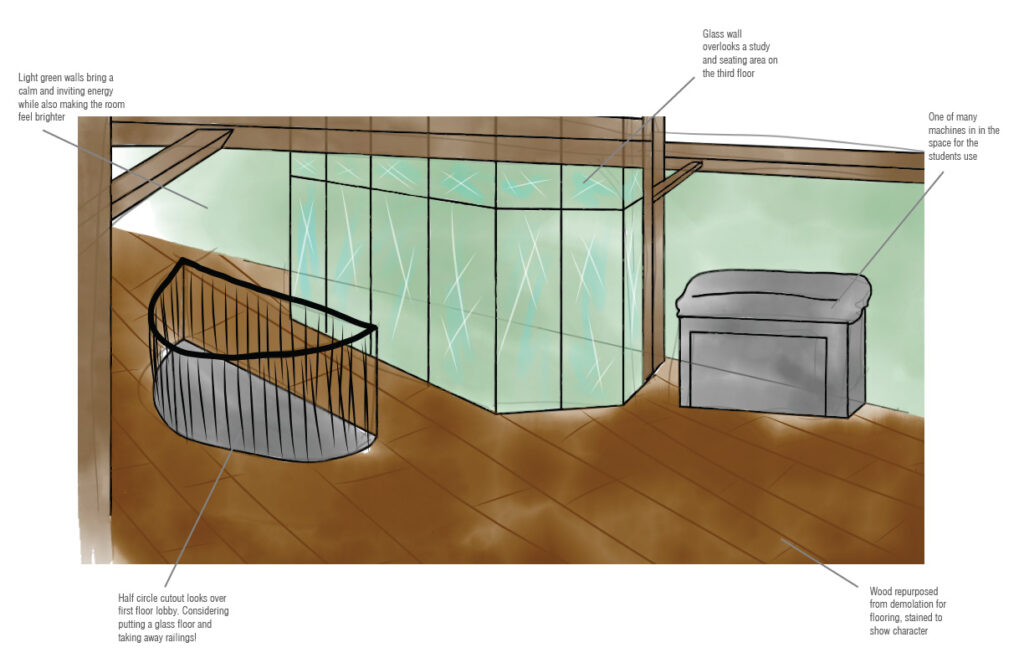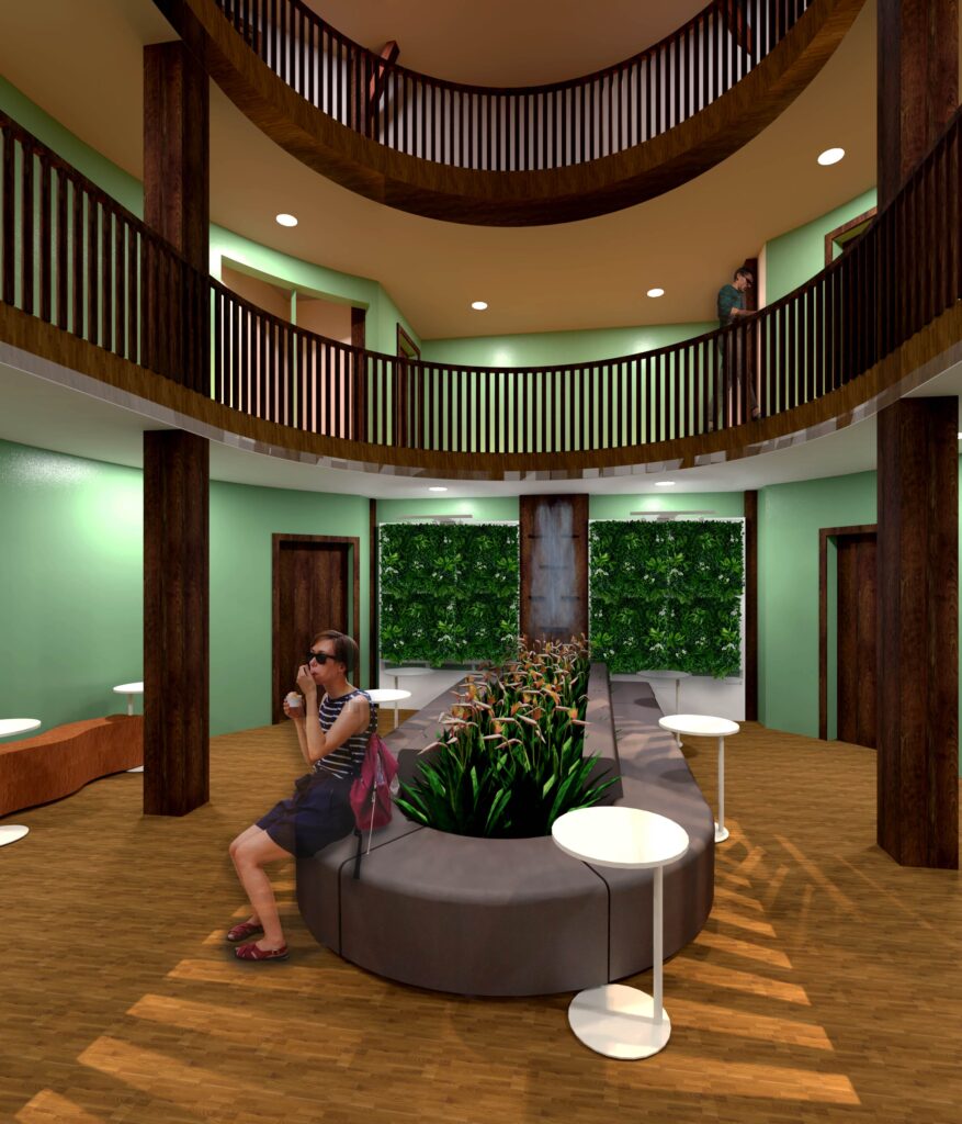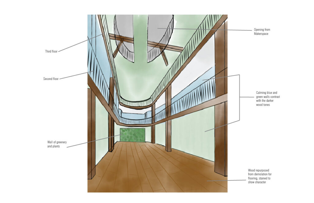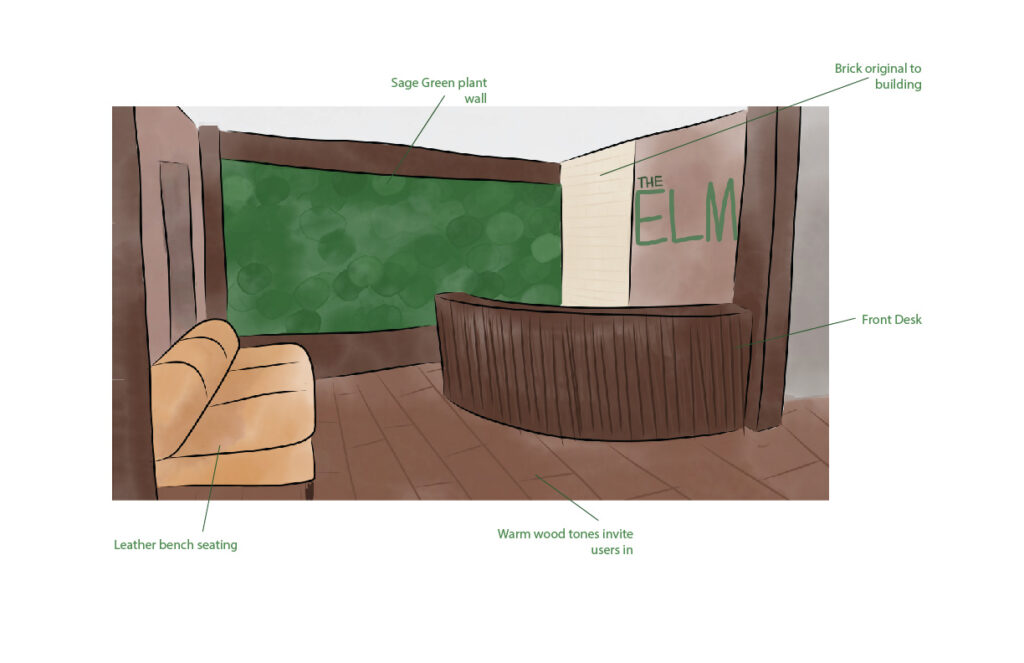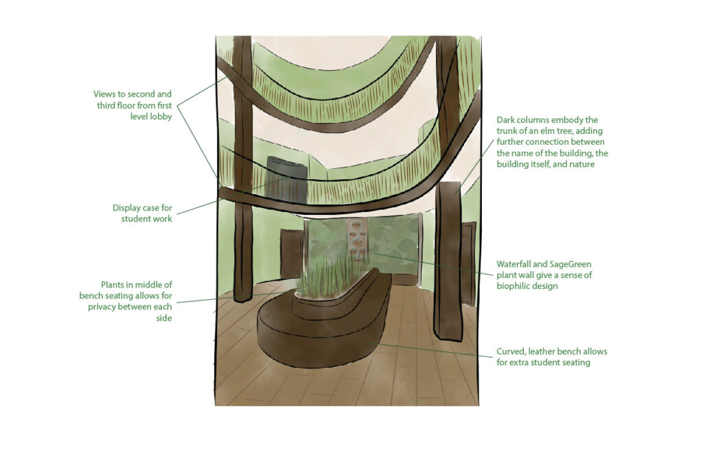 The Elm is intended to be a space for students to collaborate, innovate, and learn while feeling welcomed by all. The space utilizes wood, leather, live plants, a water feature, as well as other natural materials in order to create a strong sense of biophilic design and to make the user feel as though they are within an elm tree. The usage of plants and a water feature allow the space not only visual relief but also auditory. The contrast between the dark wood tones and the calming green tone give the user creates a sense of structure to the space. Opening the first floor all the way to the fourth also allows for movement, as the user can see other users walking through the hallways and utilizing the other spaces in the building. All around, the space is calming and a quick relief from the hustle and bustle of day to day life.