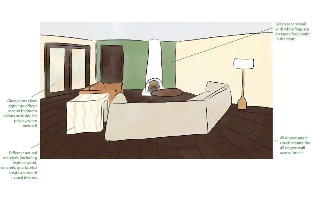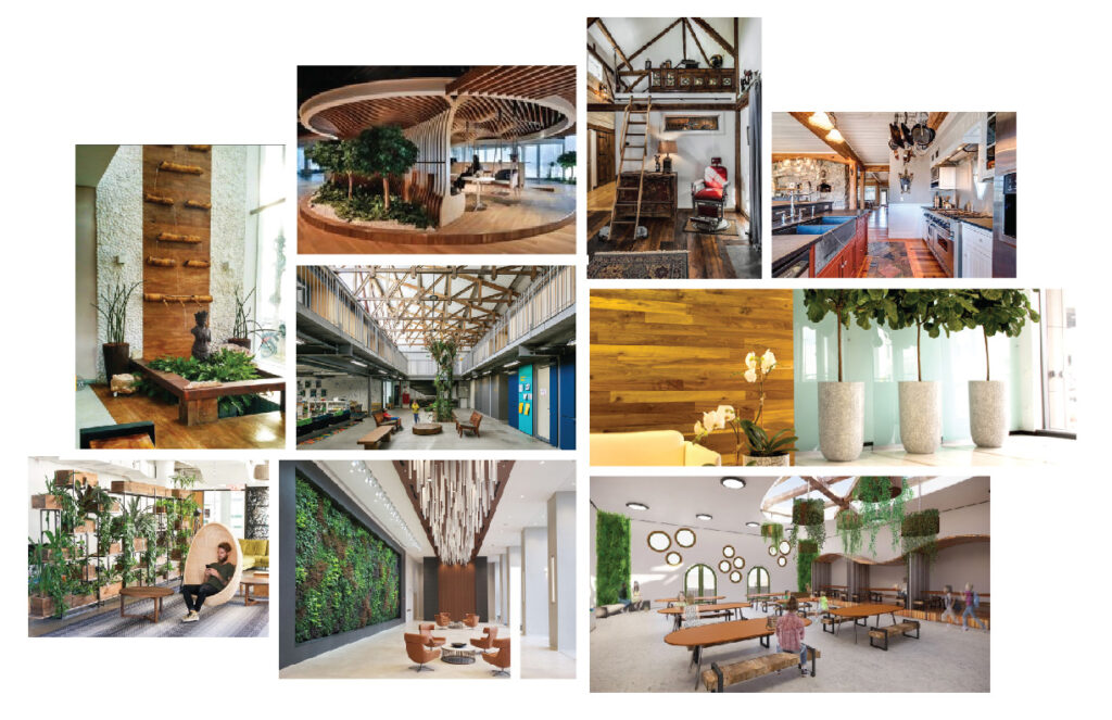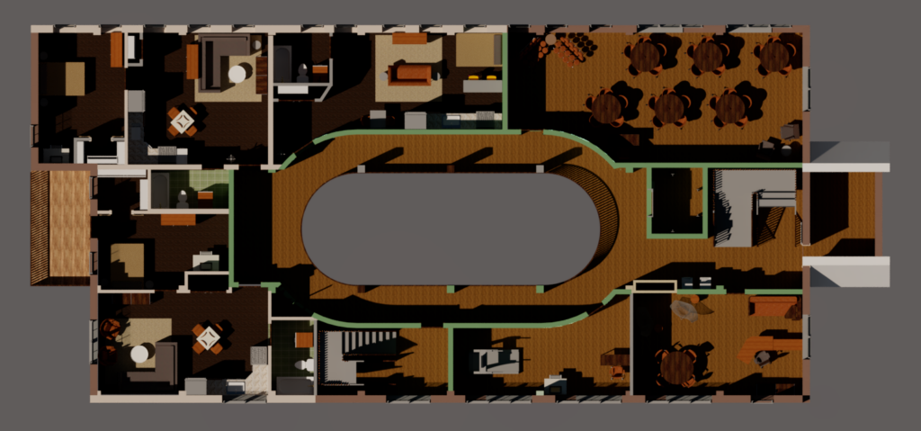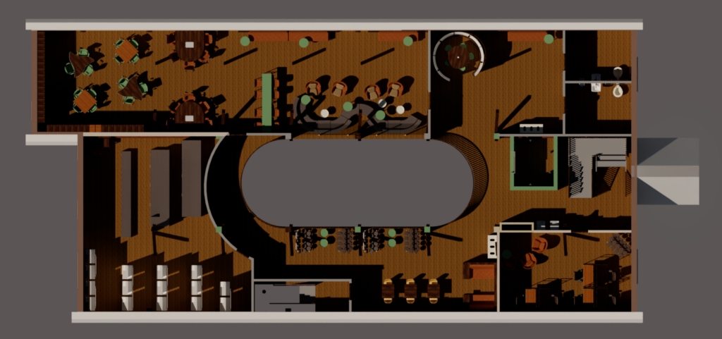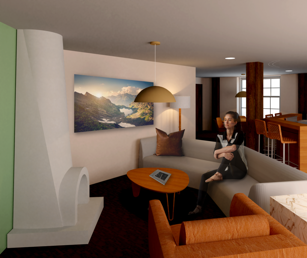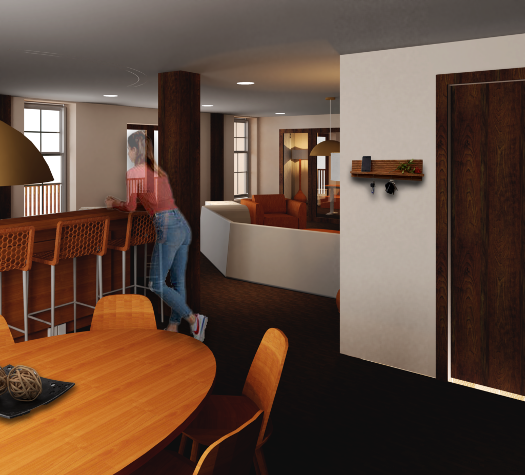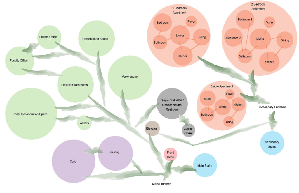 The Elm is intended to be a space for students to collaborate, innovate, and learn while feeling welcomed by all. The space utilizes wood, leather, live plants, a water feature, as well as other natural materials in order to create a strong sense of biophilic design and to make the user feel as though they are within an elm tree. The usage of plants and a water feature allow the space not only visual relief but also auditory. The contrast between the dark wood tones and the calming green tone give the user creates a sense of structure to the space. Opening the first floor all the way to the fourth also allows for movement, as the user can see other users walking through the hallways and utilizing the other spaces in the building. All around, the space is calming and a quick relief from the hustle and bustle of day to day life.