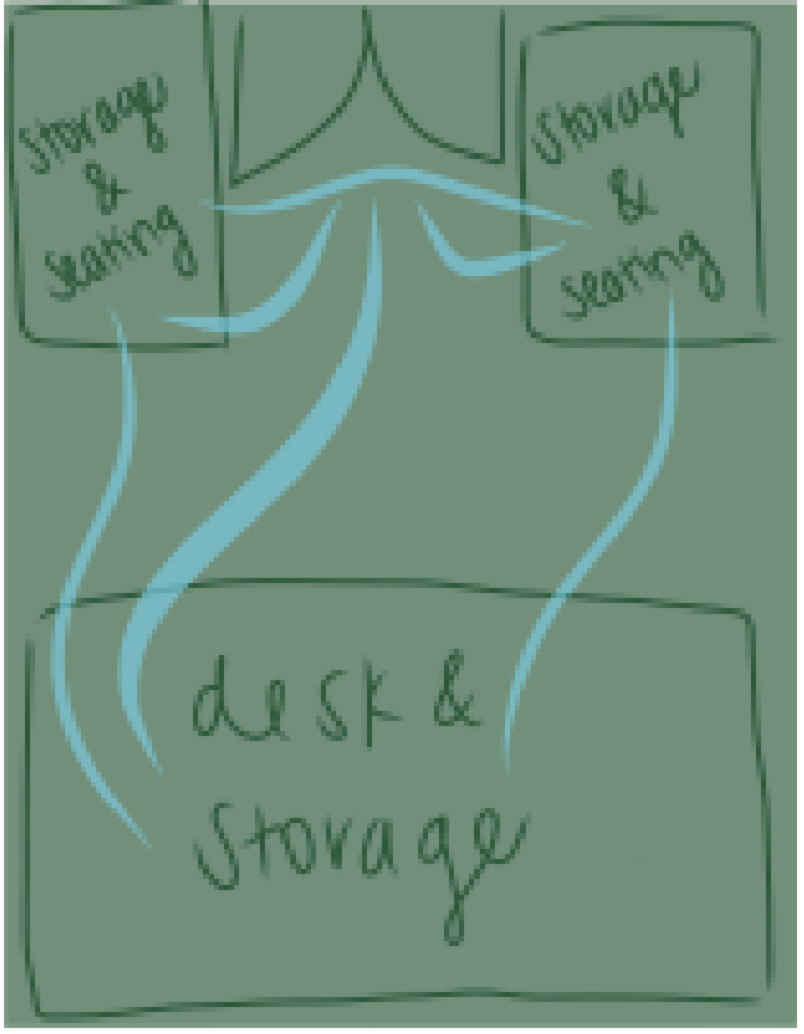 Three office layouts with circulation patterns and inspiration sketches.